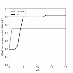 First, we explore how to search for polymers with outstanding values in a particular property. Here, we search for polymers with high thermal conductivity using the Expected Improvement (EI) acquisition function and compare the performance against random sampling.