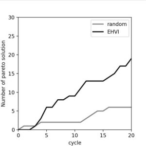 Finally, we search for polymers that are simultaneously superior in multiple properties. In many cases, properties are in trade-off, and thus we aim to identify solutions that are not dominated by others—known as Pareto-optimal solutions. Here, we search for Pareto solutions for heat capacity and refractive index using Expected Hypervolume Improvement (EHVI).