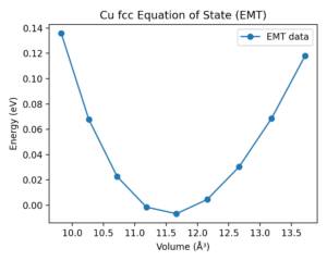 atoms.calc = EMT()attaches a lightweight empirical calculator. - Energy/volume sweep: loop over
